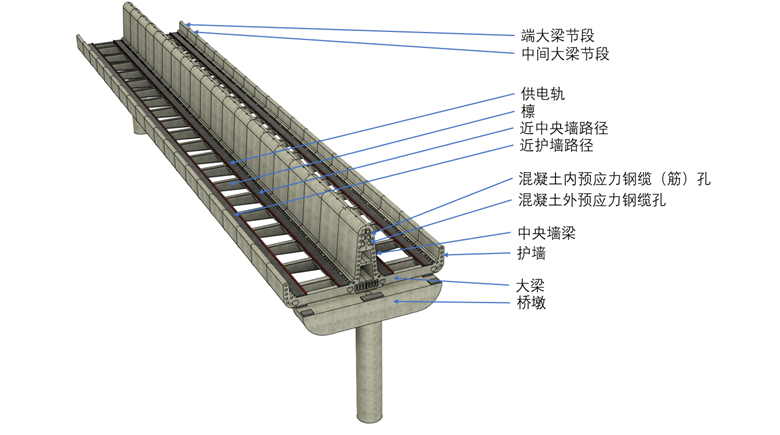 RoTao高架轨道为改进的大梁桥结构设计,该结构包括一个高而狭窄的中央墙型梁、墙型梁两侧的较低的护墙、带有可选加热路径的开放式桥面板、自动驾驶参考和供电导轨。设计包括以下组成部分:(1)位于桥墩顶上的大梁; (2)位于桥中间的类似公交车高度的中央墙型梁,中央墙型梁将两条车道分隔开,中央墙型梁高、中空且狭窄;它用于悬挂和支撑大梁的大部分重量和负载; (3)每个车道的开放甲板是中空的,并包含两个与车辆的两个车轮轮距相匹配的路径(路轨或轨道):近墙型梁轨道位于中央墙型梁附近,而近护墙轨道则位于护墙附近; (4)这两个轨道均配备了V(自动驾驶车辆)驾驶参考,以确保车轮位于各自的路径上。 (5)大梁内有很多孔,用来容纳预应力电缆或钢筋,以支撑桥梁、甲板以及负载。