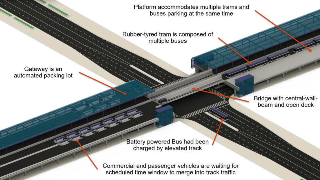 Rotao混合交通系统是在原有的公路交通上方加建Rotao高架轨道及附属设施而形成的立体交通系统。该交通系统被称之为混合交通系统不仅因为它是地面交通和高架交通的混合应用,更是因为其高架轨道可以提供给公交车、商用车及私家车混合使用。